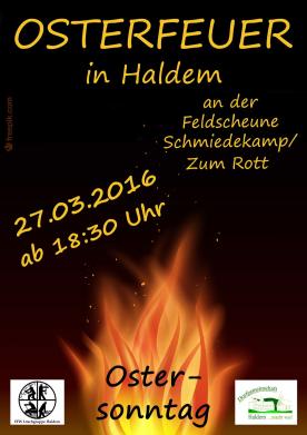 Dieses Jahr übernehmen zum ersten Mal die Haldemer Dorfgemeinschaft und die Mitglieder der aktiven Löschgruppe Haldem gemeinsam die Organisation und Durchführung des Osterfeuers. Das Team hat sich dazu entschieden, das gemütliche Beisammensein rund ums Feuer wieder am Ostersonntag zu veranstalten.